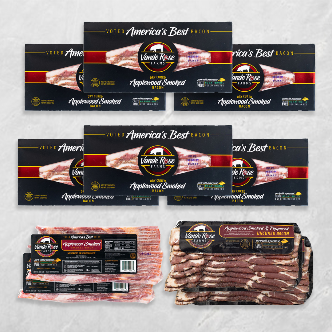 Start every morning with the perfect lineup of artisan bacon. The Vande Rose Bacon Breakfast Bundle brings together all three of our signature applewood-smoked varieties in a generous 10-pack set: six packs of America’s Best Dry Cured Bacon, two packs of America’s Best Uncured Bacon, and two packs of Peppered Uncured Bacon.